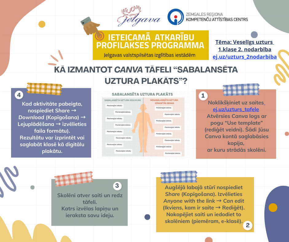 Decembrī piedāvājām aktivitāti sākumskolas skolēniem – interaktīvo tāfeli "Sabalansēta uztura plakāts", kas veidota platformā Canva. Skolēni veido plakātu, izmantojot cilvēka kontūru, vienā pusē cilvēkam attēlojot visus sabalansēta uztura ieguvumus, piemēram, spēcīgi muskuļi vai mirdzoši mati, bet otrā pusē cilvēkam attēlojot nesabalansēta uztura izraisītās sekas, piemēram, trausli kauli vai nogurums. Aktivitātes īstenošana ir vienkārša un pieejama visiem – skolotājs kopīgo Canva šablonu ar klasi, skolēni grupā vai individuāli papildina tāfeli ar savām idejām un domām. Gatavo darbu var gan izdrukāt, gan saglabāt digitāli. Akltivitāte pieejama šeit!